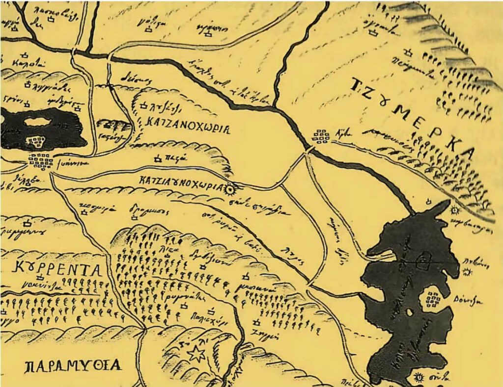 Στη φωτογραφία Απόσπασμα Χάρτη Ηπείρου και Αλβανίας του Κοσμά Θεσπρωτού (περ. 1800).