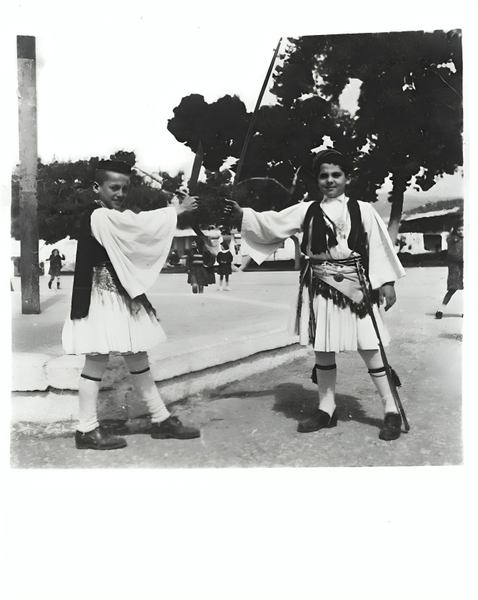 Τέλος δεκαετίας ’40 – Δυο νεαροί τσολιάδες “διασταυρώνουν τα ξίφη τους” στην πλατεία Σκουφά, μετά το πέρας της λειτουργίας. Πρόκειται για τους μαθητές Μάξιμο Μπανταλούκα και Γεώργιο Μπάφα (αργότερα καθηγητή στο Τμήμα Χημικών Μηχανικών του Ε.Μ.Π.). [Φωτο από το αρχείο του κ. Μ. Μπανταλούκα].