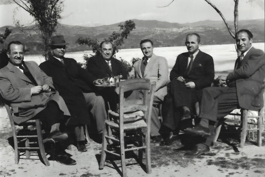 1956 – Μια παρέα διακεκριμένων νομικών της Άρτας, στου Κρυστάλλη, με φόντο το ποτάμι. Από αριστερά : Μιχ. Ράπτης, Αχιλ. Οικονόμου, Δημ. Ζαρκαλής, Νίκος Τούμπουρος, Δημ. Καρατζένης (Βουλευτής Ελληνικού Συναγερμού – Ε.Ρ.Ε.). [Φωτο από αρχείο Μικαέλας Ράπτη, Παρουσίαση Κ. Μπανιάς]