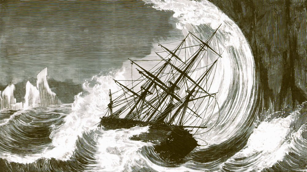Στη φωτογραφία “Engraving of sinking ship in a hurricane – Χαρακτικό με πλοίο που βυθίζεται σε σφοδρή καταιγίδα”.