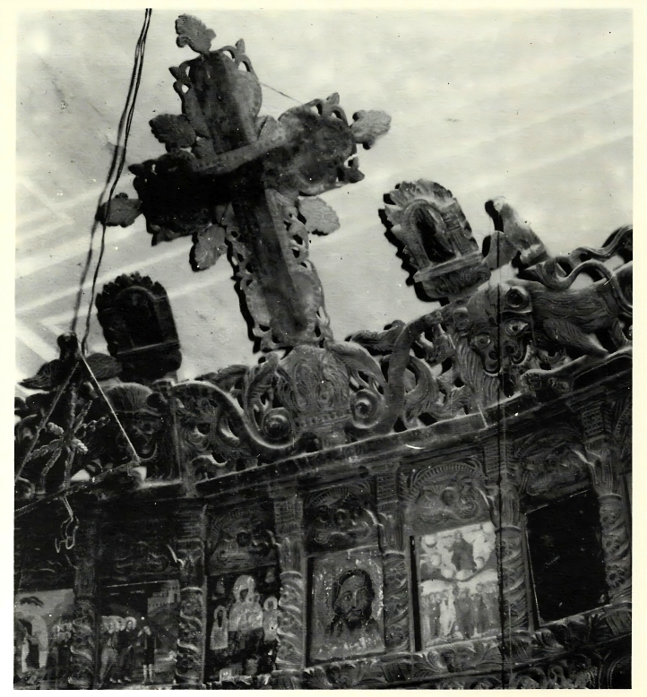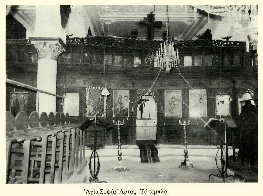 …και εδώ το τμήμα του τέμπλου με τον μεγάλο σταυρό! Το τέμπλο της Αγίας Σοφίας Άρτης “…είναι κατασκευασμένο από ξύλο καρυδιάς και είναι αχρύσωτο, όπως κατά κανόνα είναι όλα σχεδόν τα Ηπειρωτικά εικονοστάσια του 19ου αιώνα, χωρίς καθόλου χρώματα, περασμένο μόνο με ελαφρό βερνίκι πριν από πολλά χρόνια….”. Όπως διακρίνουμε, σε σχέση με την πρόσφατη φωτογραφία, ο παλιός σταυρός έχει αλλαχθεί.